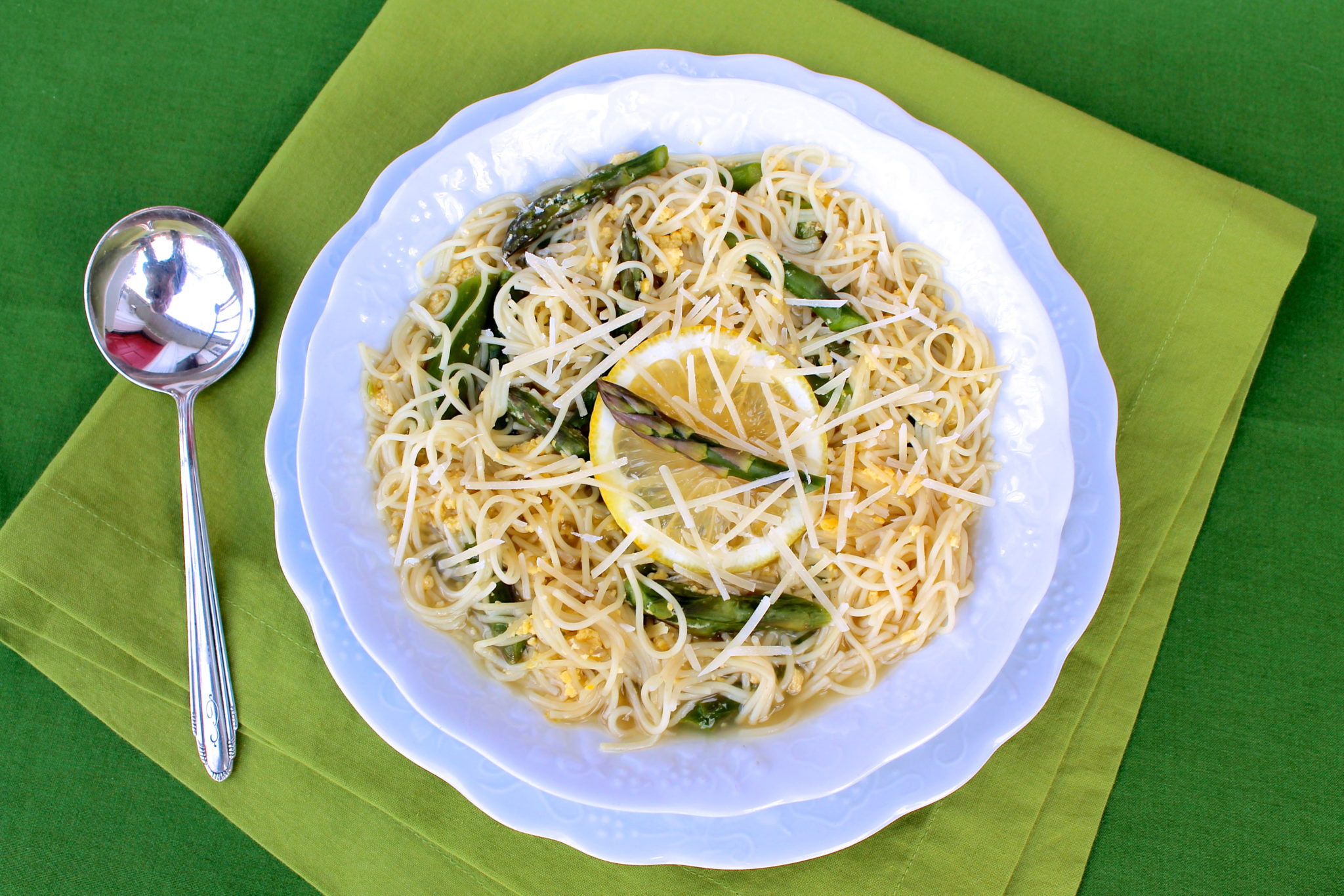 While I started making this soup with angel hair pasta many years ago, I now often make it with rice or bean vermicelli noodles for a gluten-free option. (The top photo shows the vermicelli noodles, the bottom standard angel hair pasta.) The addition of egg yolks is a special part of this soup. They create a velvety broth that I really love. Sautรฉing the asparagus briefly, removing to a plate, and adding it back in at the end ensures a still-crisp stalk that makes this soup a real treat.