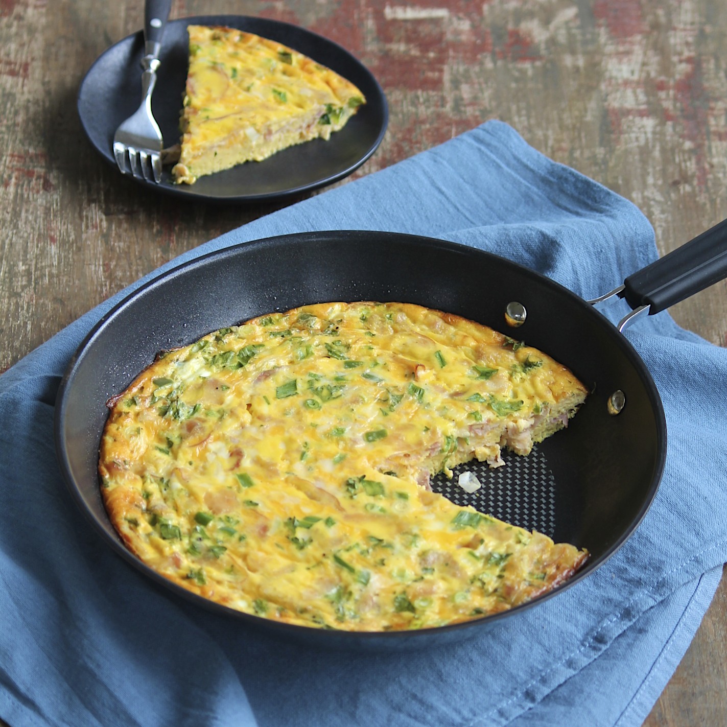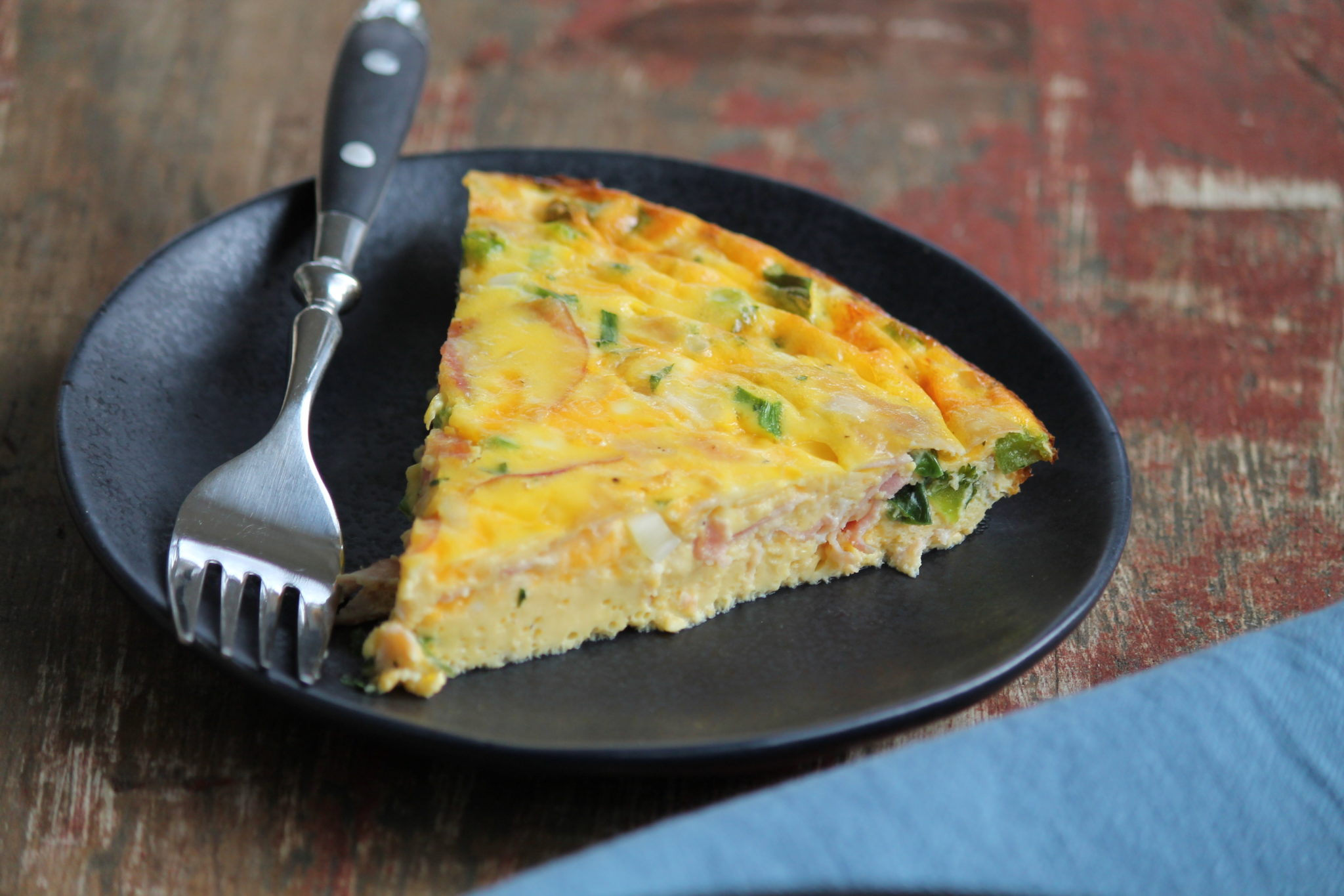 Similar to a frittata, this baked omelet can be mixed in one bowl and requires no sautรฉing prior to baking. Itโs a super speedy meal that is perfect with your favorite deli ham or leftover baked ham.ย