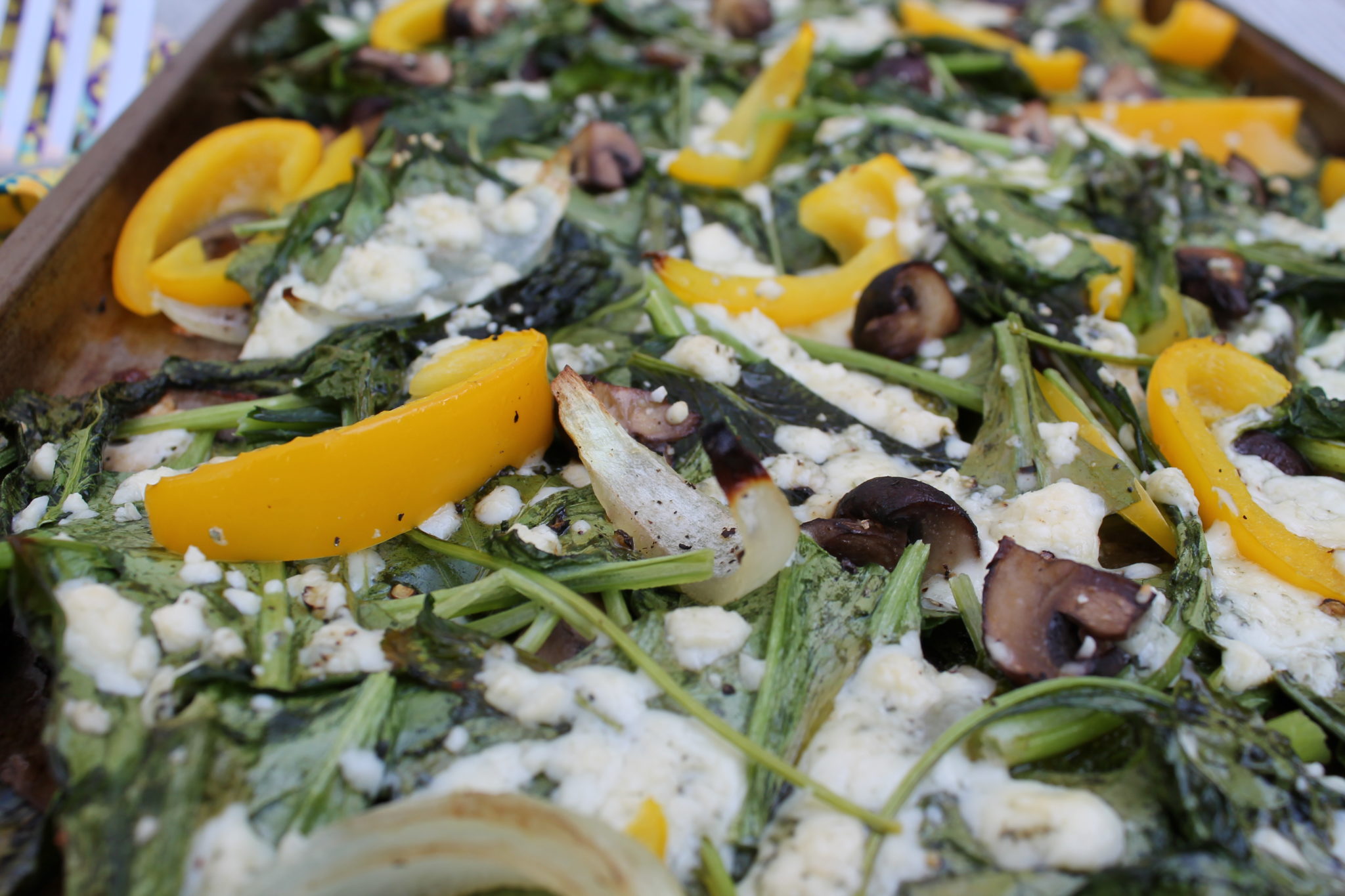 Baked bitter greens, fresh out of the oven. Roasting the mushrooms and onions first creates depth of flavor and a welcome heartiness to the dish. The blue cheese topping imparts incredible flavor that pairs perfectly with the earthy mushrooms as well as the onions, peppers and greens.