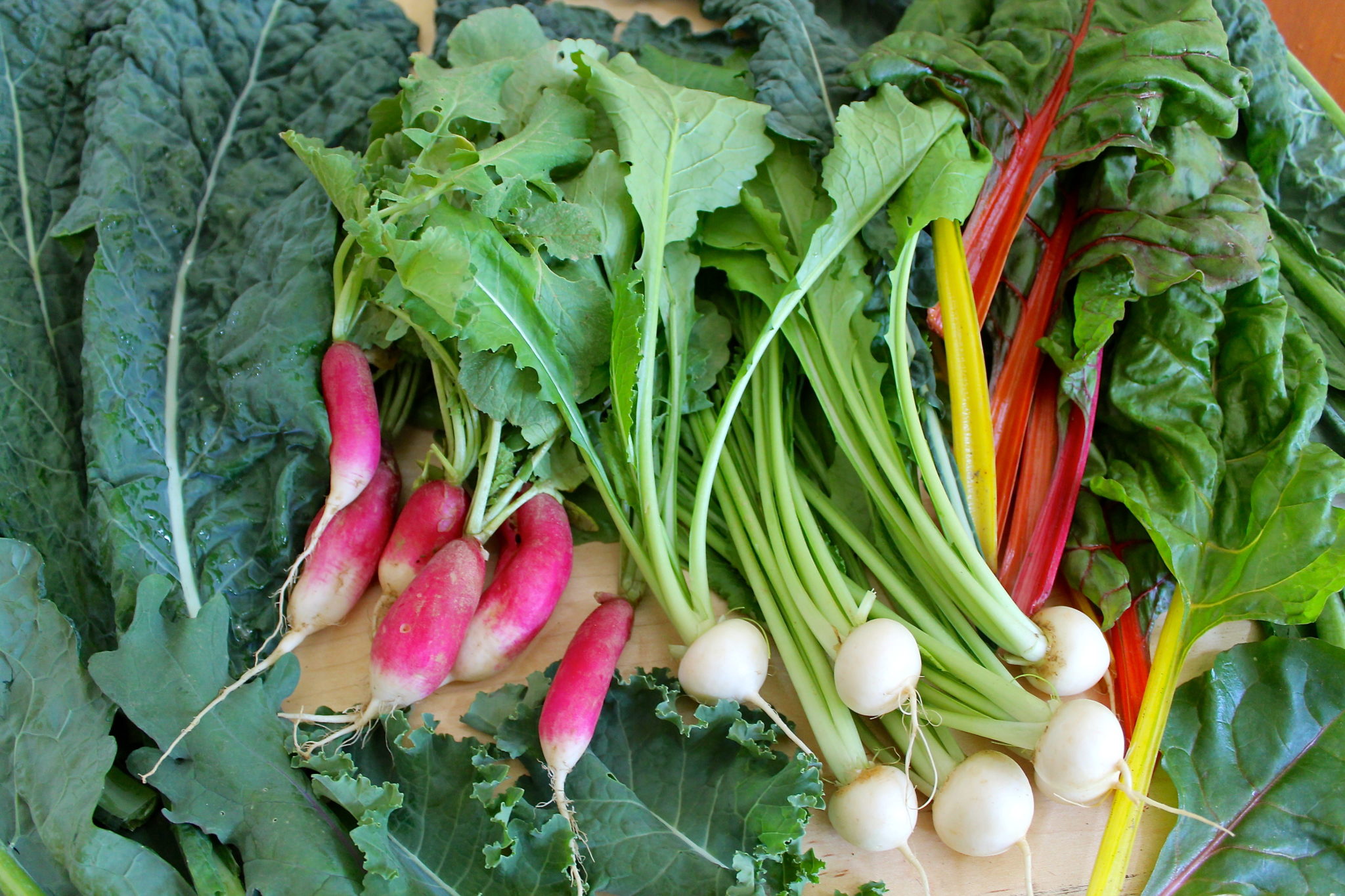 Greens from my garden have been supplemented with those from Lancaster Central Market’s farm stands. Here is my latest haul: Lacinato kale and two other varieties of kale, radishes and turnips (as much for their edible greens as much as for the root ends!), and Swiss chard.