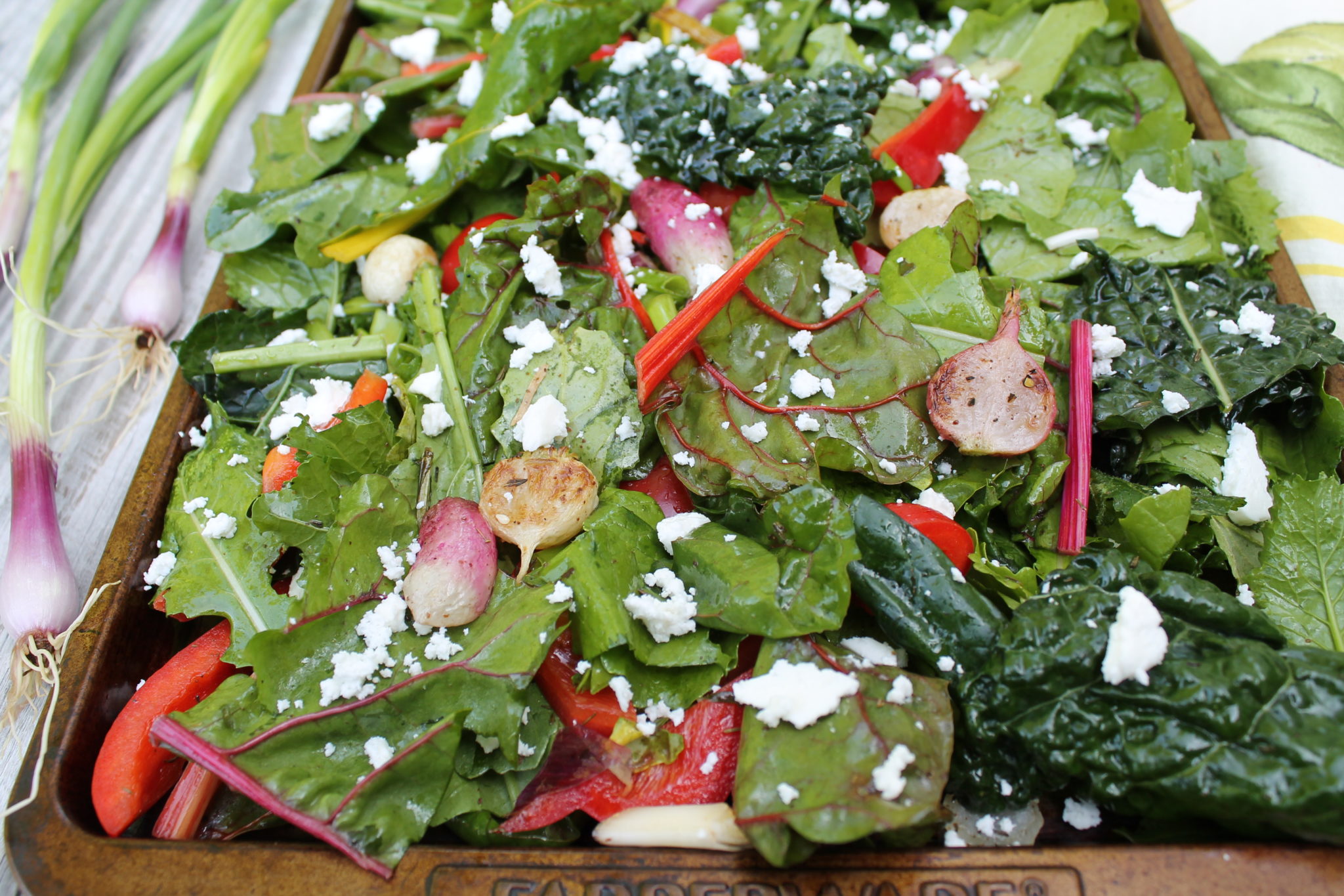 Baking greens may just be my new favorite way to enjoy them. Kale, chard, turnip, and beet greens are all great choices. The heat of the oven mellows bitter tasting greens, and the combination of flavors and textures in this recipe creates an incredibly satisfying dish. I like to add the pepper in the second stage of baking to keep it slightly crisp.