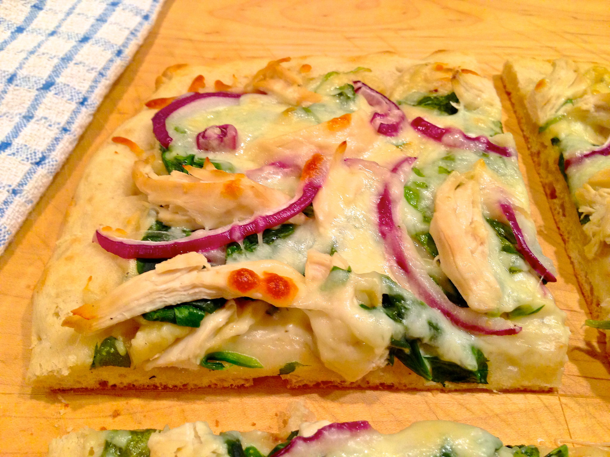 - Top the cheese mixture with the spinach, chicken and onion. Then sprinkle on the mozzarella cheese.