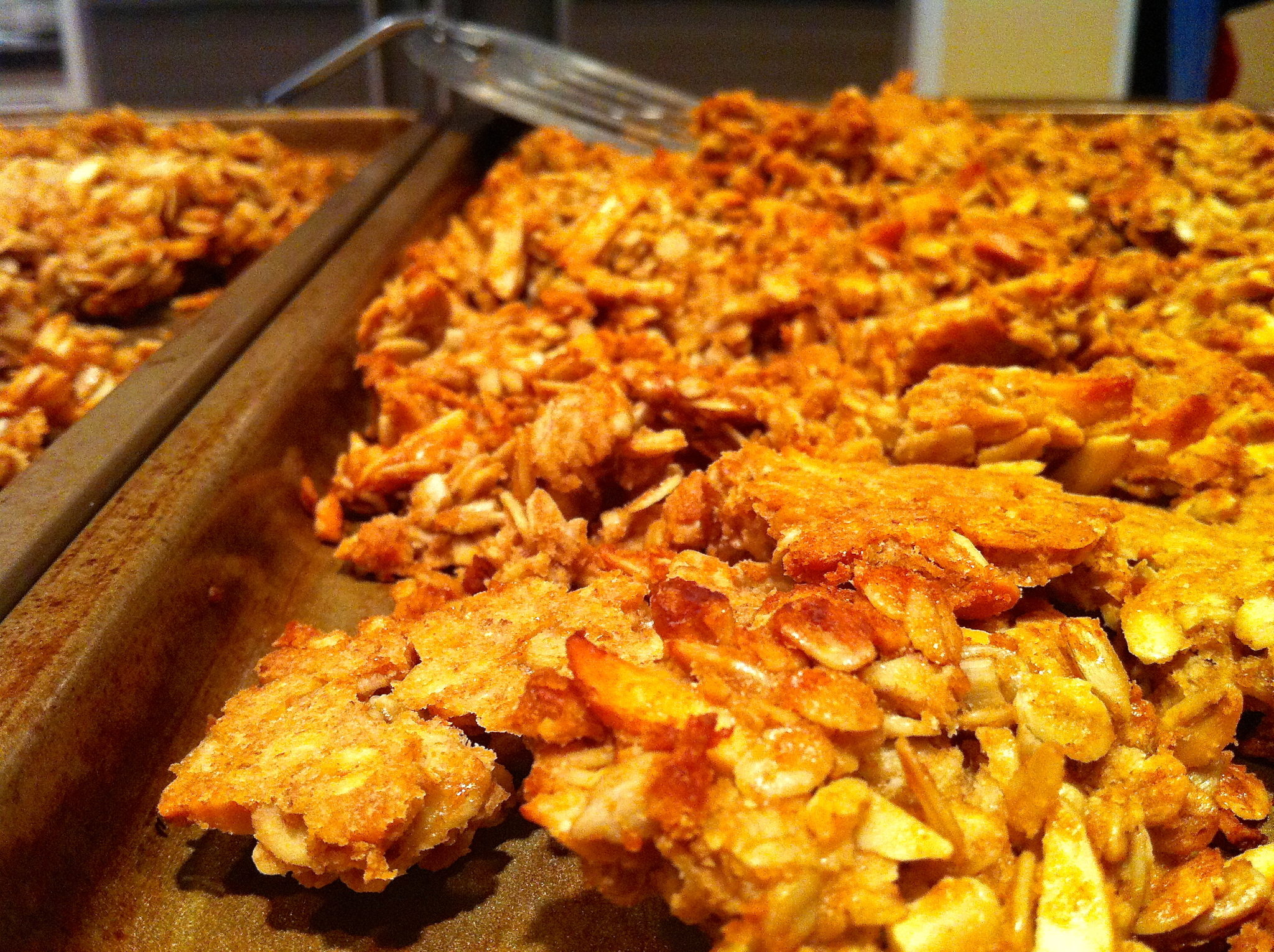 - Bake for 20 minutes, and then flip in large sections with a spatula. Switch the trays around in oven and bake 20-30 minutes more, flipping every 10 minutes, or until dried out and lightly golden. (Helpful hints: If you're not interested in chunks, stir and break up the mixture as you go. If you want bigger chunks, flip in large sections. You can break them into smaller pieces later, if desired. For really big chunks, you may skip the flipping/stirring altogether, but do rotate the baking sheets. Note that the granola will likely take longer to dry out in this case and you may need to reduce the oven temperature by 25 degrees if the edges begin to brown too much.)
