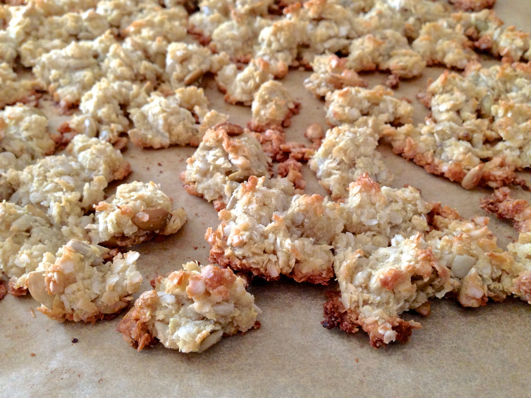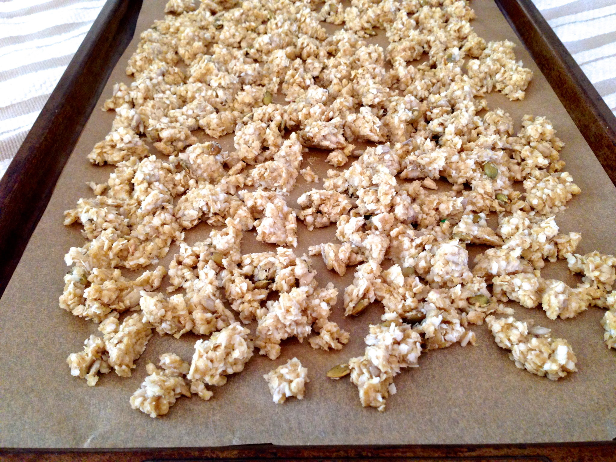 - Spread the mixture onto the parchment-lined baking sheet. (I take a few minutes to press the mixture into an even layer and then separate into similar-size chunks. See photo. I use a spatula to sort of slice into pieces and then work into clumps with my fingers. It doesn't have to be perfect, but this will help you to get evenly-crisped chunks.)