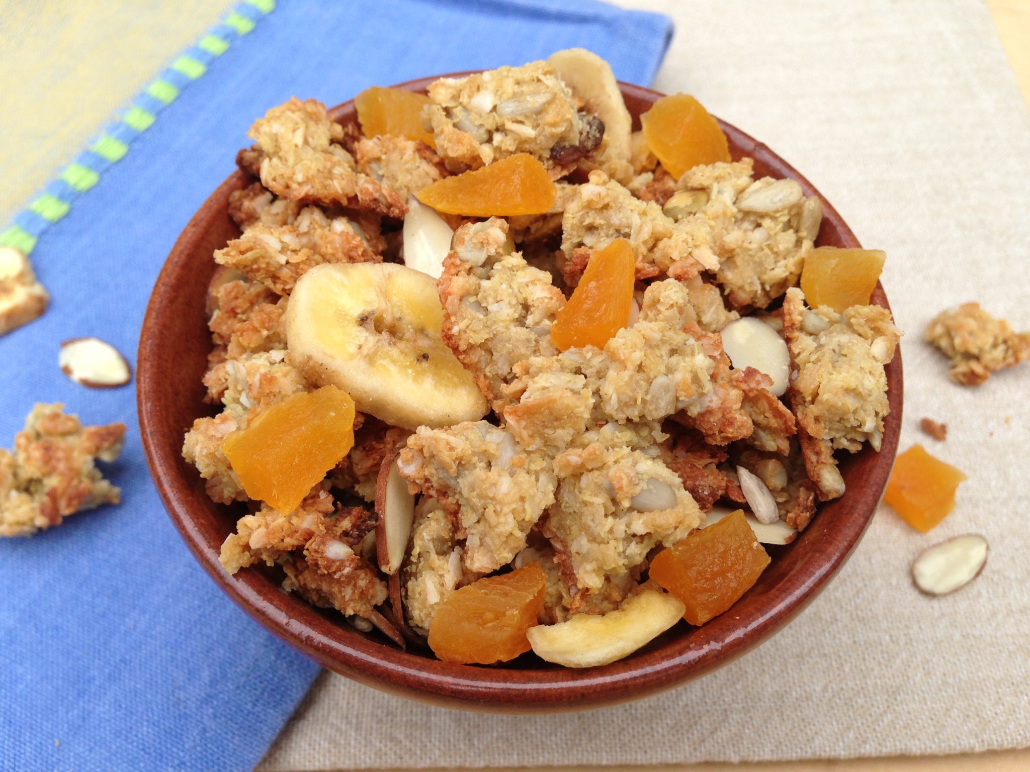 Feel free to try this recipe once and then tweak according to your tastes. You could add a little more coconut or skip it entirely. Add slivered almonds instead of the sunflower seeds and adjust the maple syrup to the sweetness level that is perfect for you. There are no oats in this recipe, so the flavor is slightly different than regular granola…but not so much that everyone may discern a difference. The first time my husband tried it, he thought the slightly different taste he detected was from the addition of sunflower seeds. He noticed something different but couldn’t quite put his finger on it. I will be excited to hear your feedback if you try!