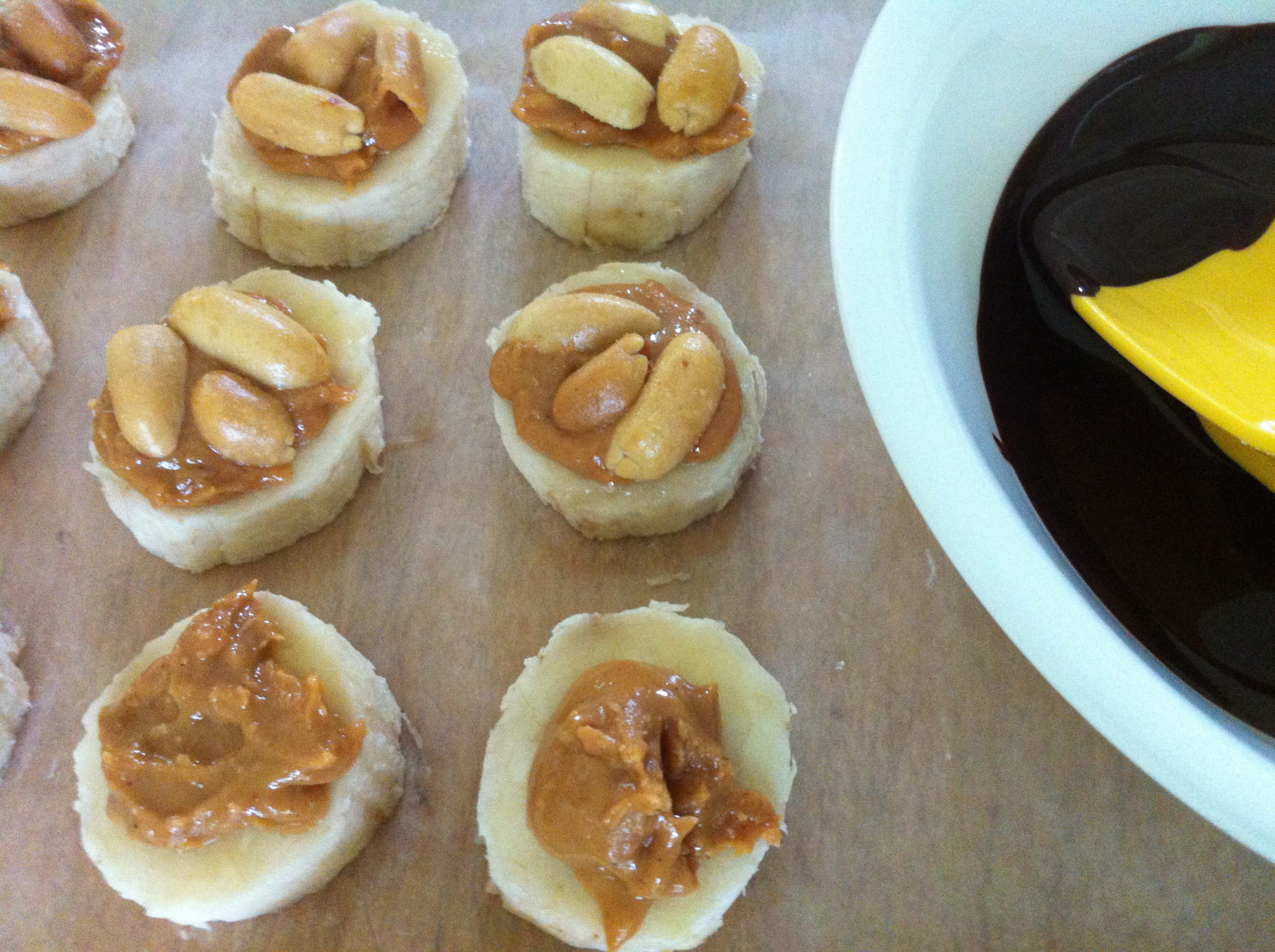 - Cut the banana into 1/3 to 1/2-inch thick "coins." ย Spread with peanut butter and top with peanut halves. ย Refrigerate while preparing the chocolate.