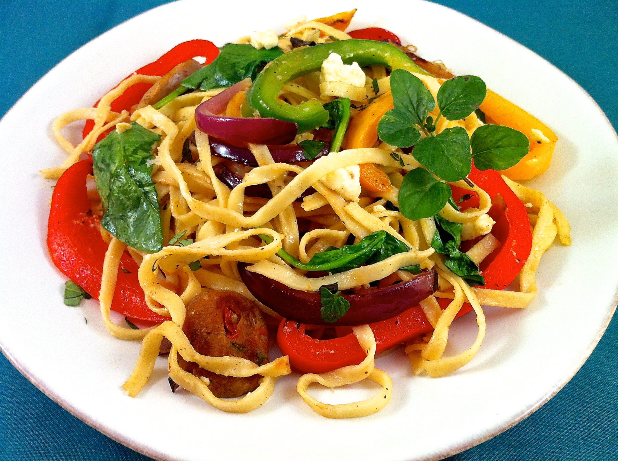 Since the fresh pasta and sausage are vacuum-packed, they will keep for several weeks in the fridge and can also be frozen. My family enjoys Greek flavors, and this meal can be loaded with veggies that are gobbled down happily with the pasta.