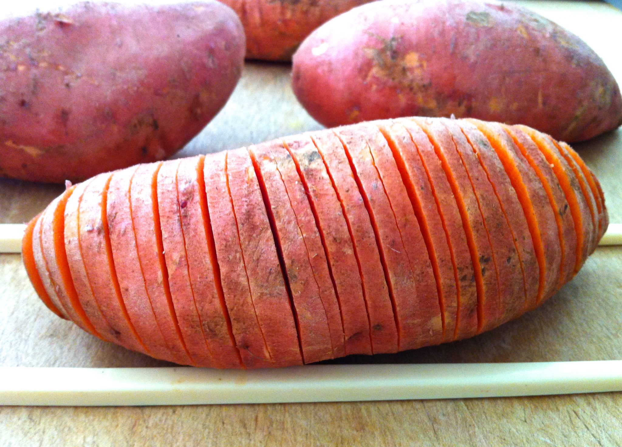 - This is Sonali's foolproof tip for perfectly sliced potatoes: "Place each sweet potato on a cutting board and line two chopsticks up along either side. Carefully slice the potato into 1/8-inch slices, cutting almost all the way down to the bottom but not all the way through. The chopsticks will help prevent you from cutting all the way through the potato." (This works very well. If you happen to dislodge any of the slices, simply tuck them back in.)