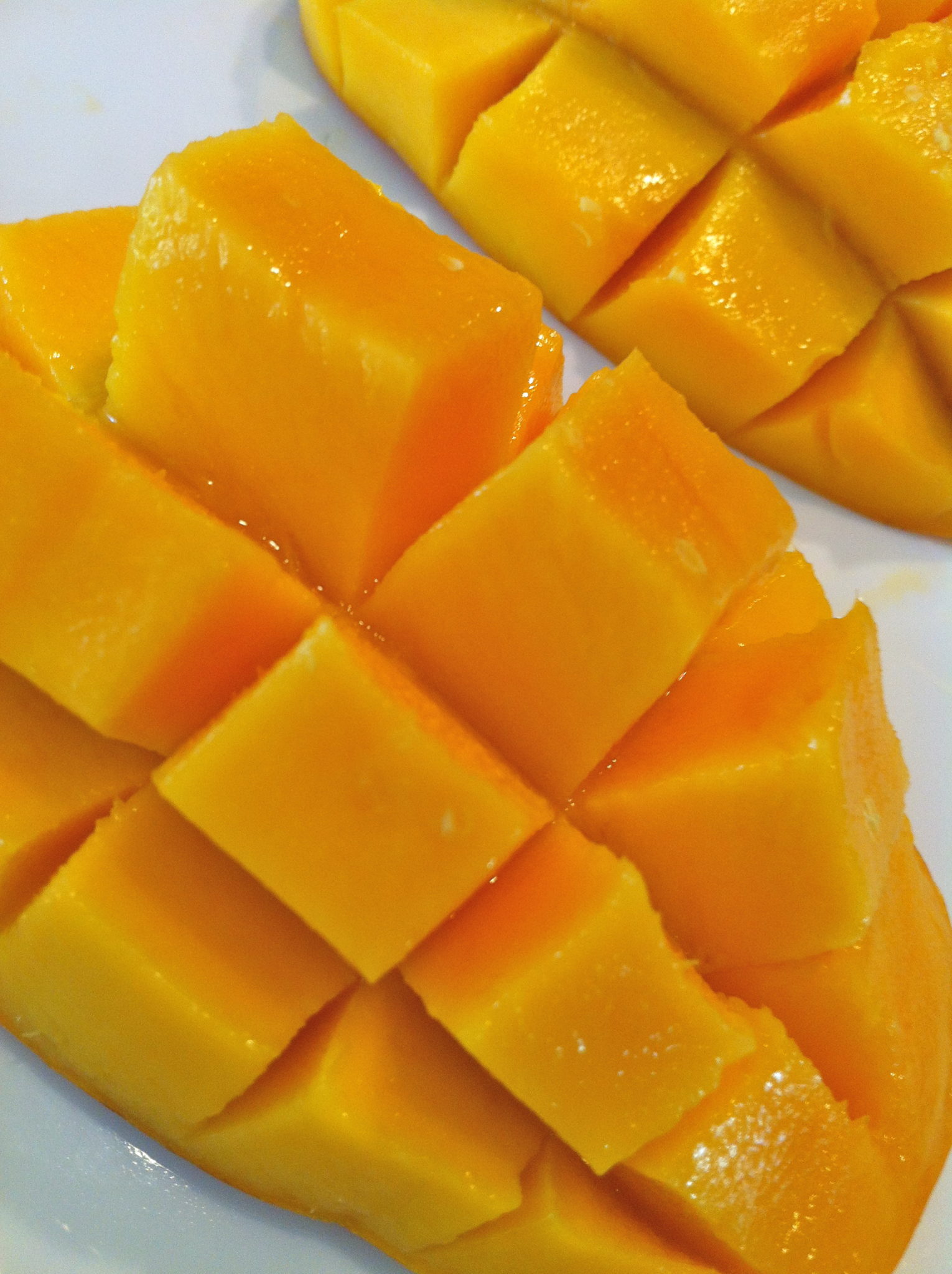 To easily cube the mango, slice all the way down the mango along the flat part of the seed. Then, slice in a checkerboard pattern without going through the skin. Invert the piece, then carefully slice off the little squares. At this point, my kids just bite the little cubes off. It’s what we call “fun food!” There will be a little more fruit clinging to the pit which you can slice off as well.