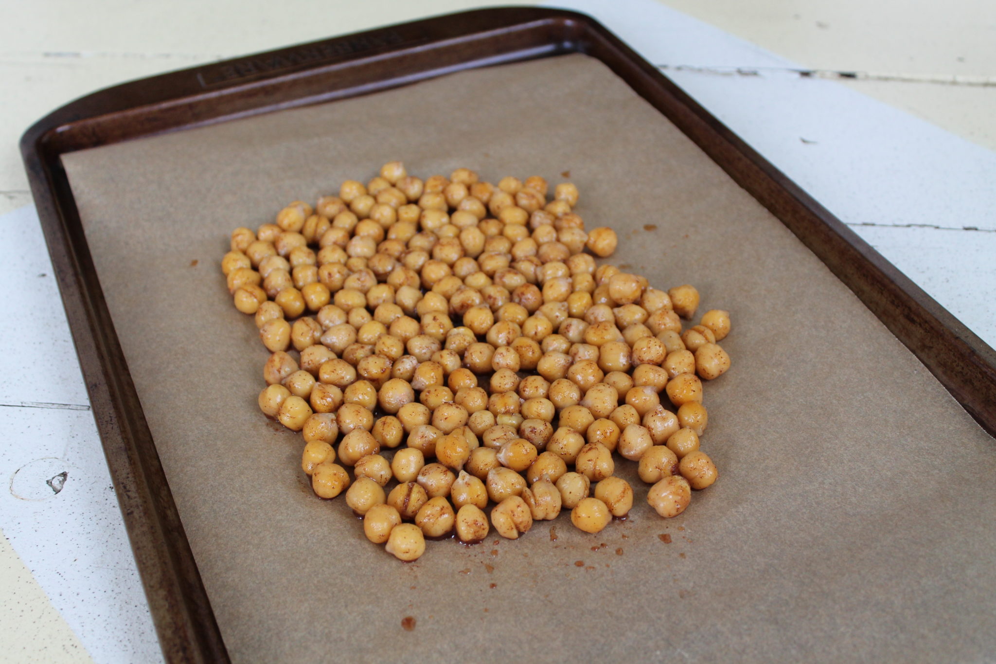 - Place the garbanzos on a well-oiled or parchment-lined baking sheet with sides. I move all the beans together on the baking sheet so that they sit in the excess syrup.