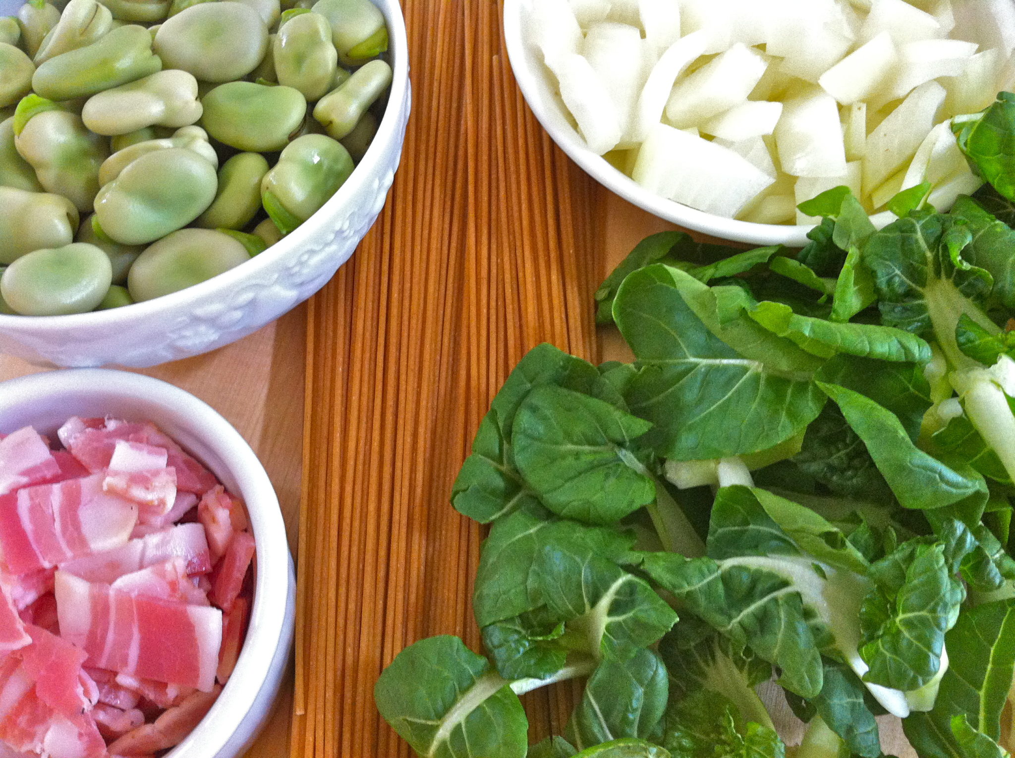 Pasta with Fava Beans, Greens & Pancetta