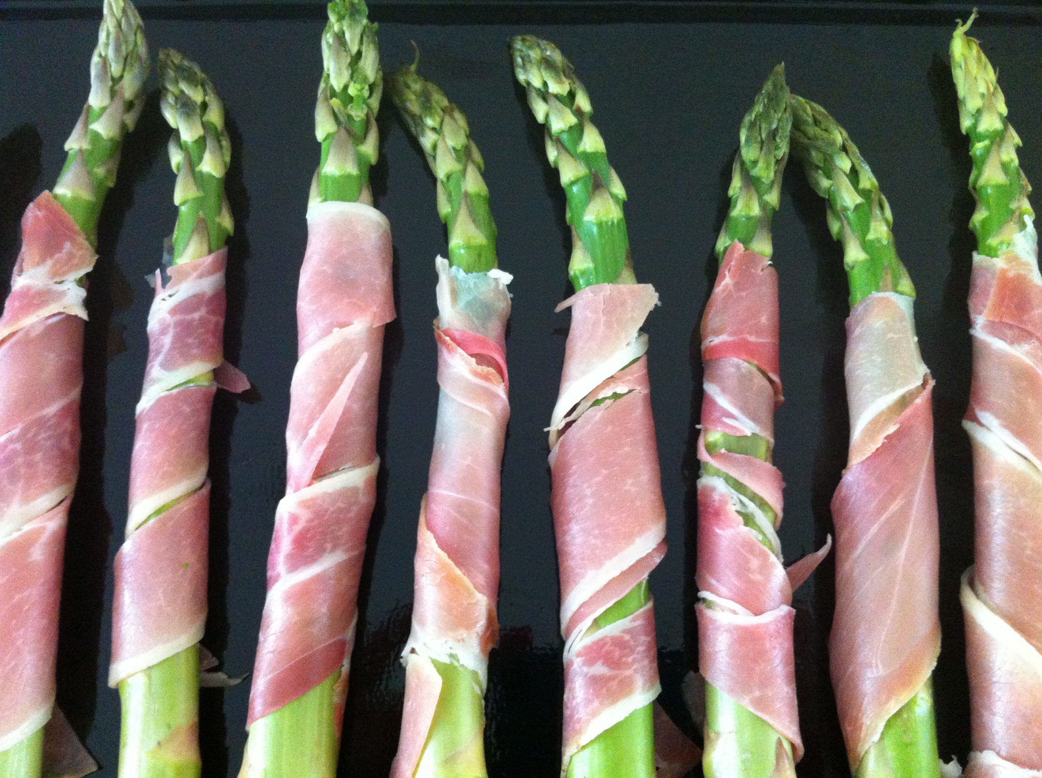 - ½ piece of very thinly sliced prosciutto for each thick spear of asparagus (you may also bundle several thin spears)