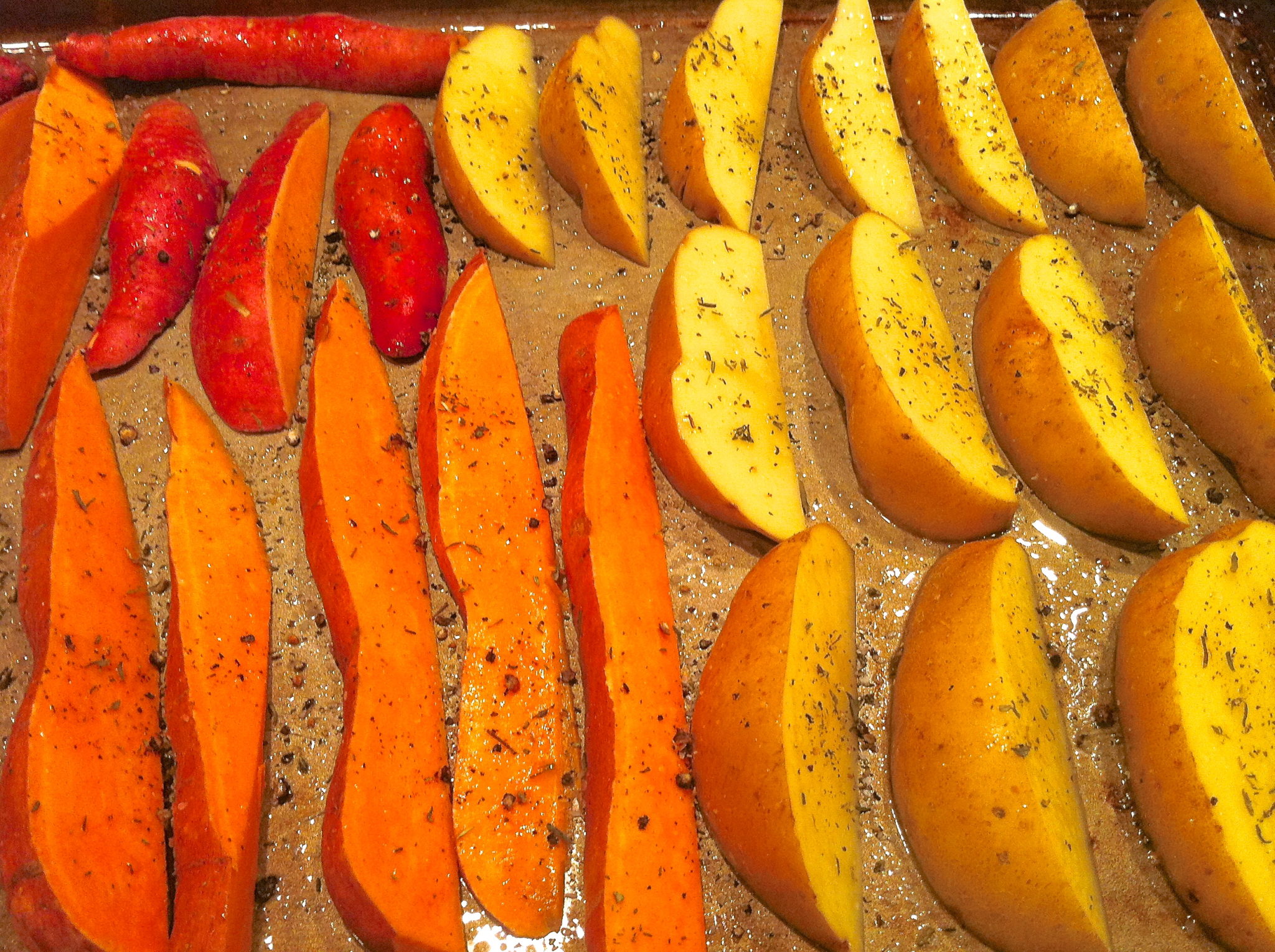 • Sweet and regular potatoes, cut lengthwise in eighths