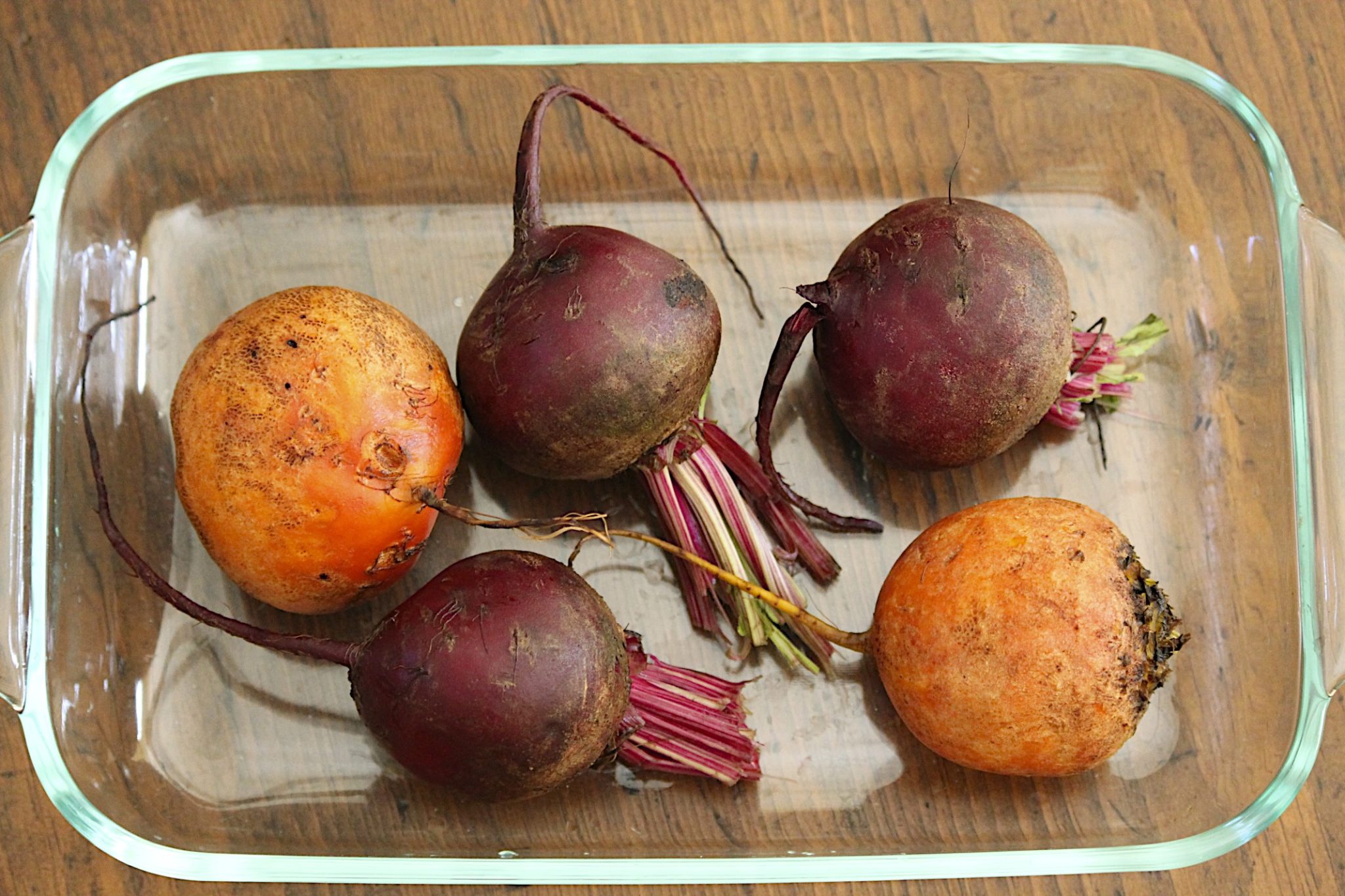- Wash and trim the beets, saving the greens for a salad or sautรฉ, if desired. I leave the rootlets and a small bit of the stem end.