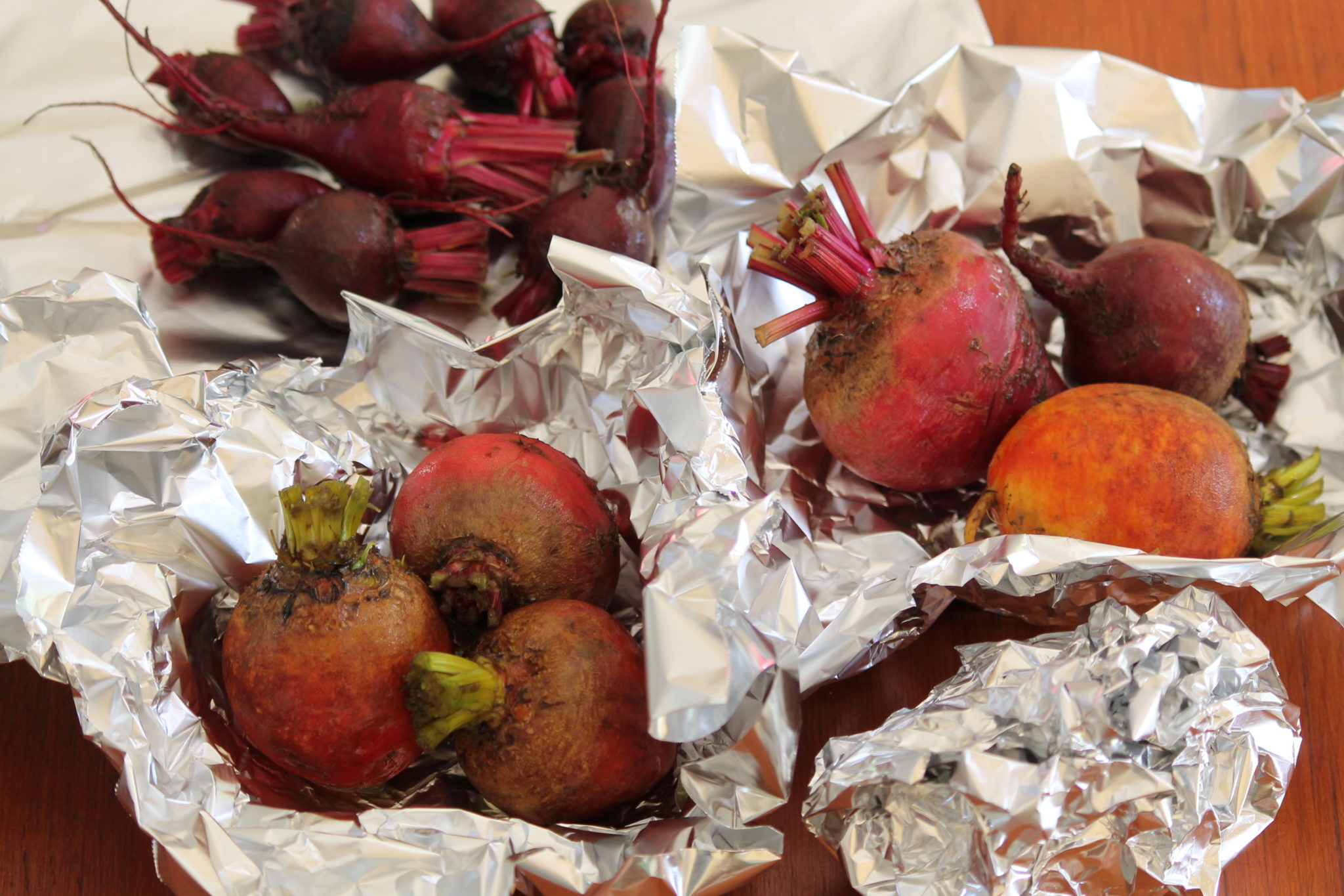 - Wrap the beets in aluminum foil, keeping a little moisture from washing the beets and drizzling with a couple of teaspoons of olive oil before sealing. If beets are not consistent in size, group and place in individual foil packets with other similar size beets. I wrap three to four medium size beets together, more if the beets are small, and two if the beets are large. This way, the beets will cook in about the same time, but if there is a vast difference in size, the beets can easily be removed from the oven as they are done.