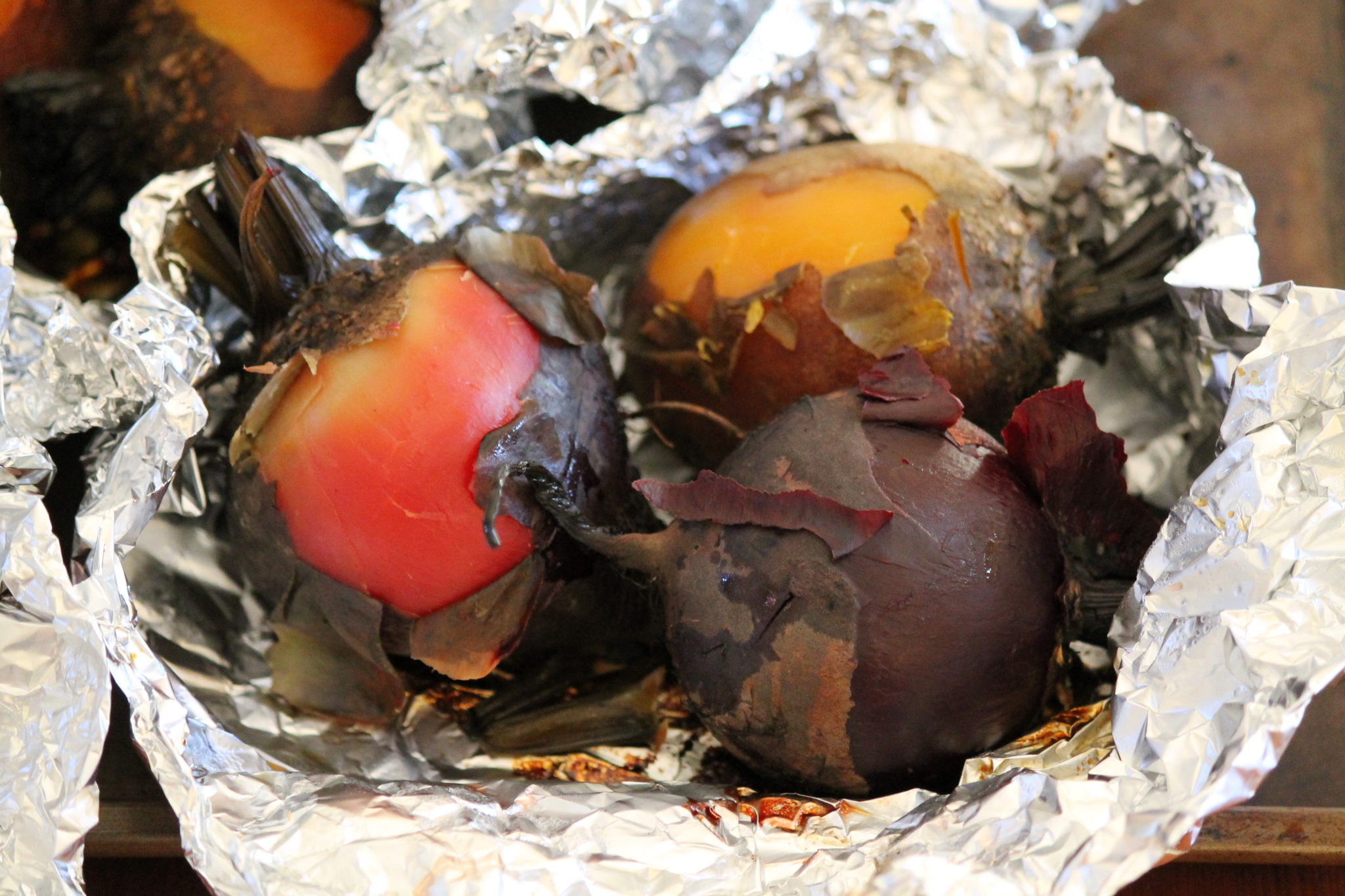 - Place the packet(s) on a baking sheet, and roast in the oven until cooked through, approximately 45 to 60 minutes, depending on size. The tip of a knife or a skewer should easily pierce the beet, yet you should feel a hint of firmness towards the center.