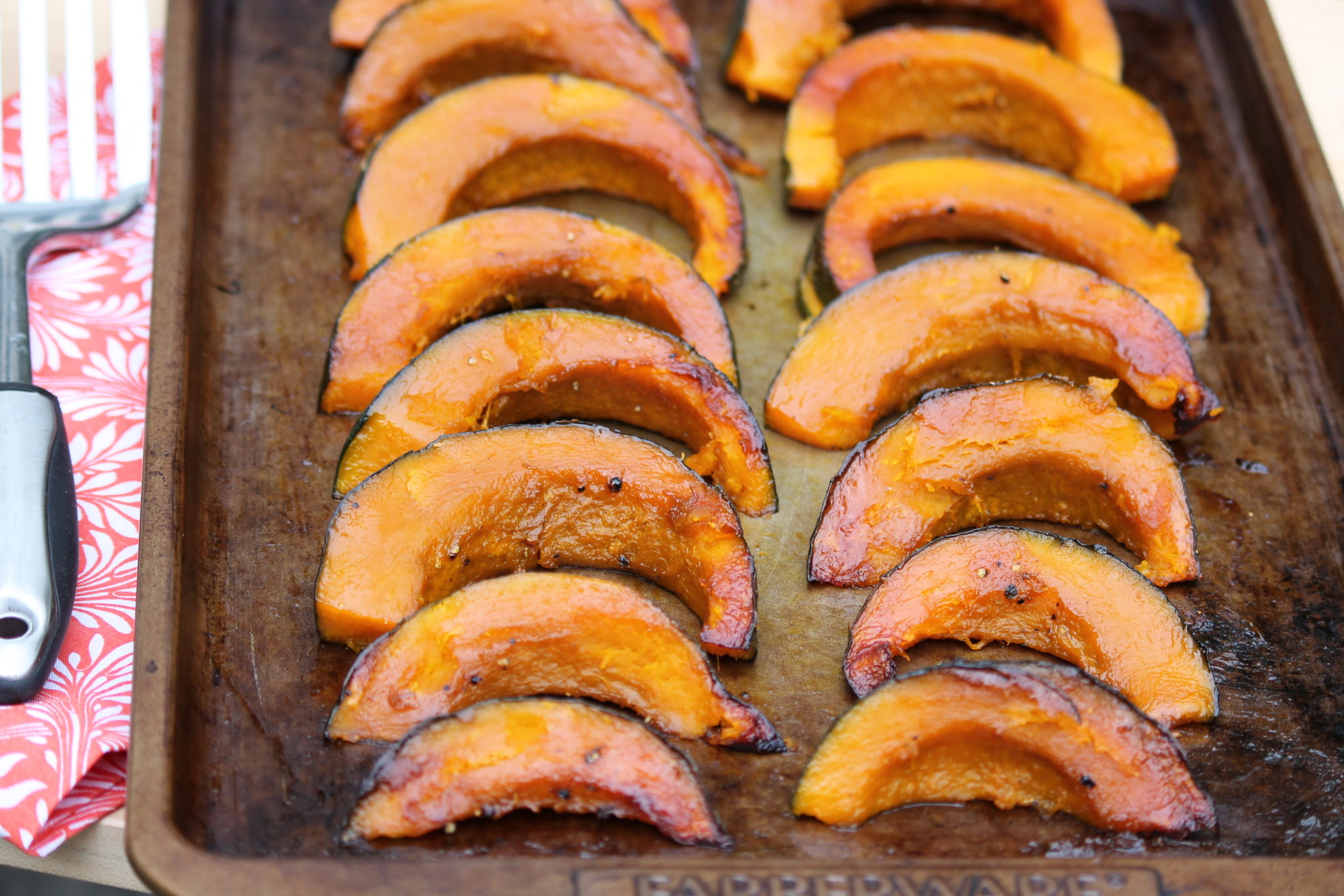 - Spread the squash pieces, cut sides down, in an even layer on the baking sheet and bake for 25-35 minutes or until just tender. Precise time will depend on oven and thickness of pieces. Use a sharp knife to test for doneness. Look for a golden brown color on the side touching the baking sheet and a hint of firmness remaining in the squash. Tip: To increase caramelization, you may broil for about 2 minutes, watching very carefully to avoid burning.