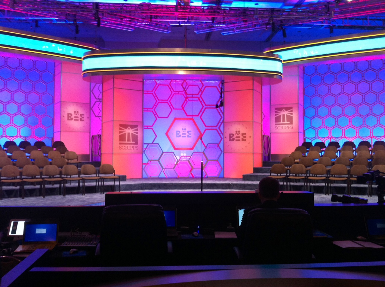 Tonight, we had a meeting in the room pictured above where the rounds will occur from here on out. The meeting reviewed all sorts of interesting history as well as the rules and details for the events going forward. The room is all set up for ESPN coverage. Tomorrow’s rounds will be live on ESPN 3, and the coverage works its way up to the main ESPN channel on Thursday night.