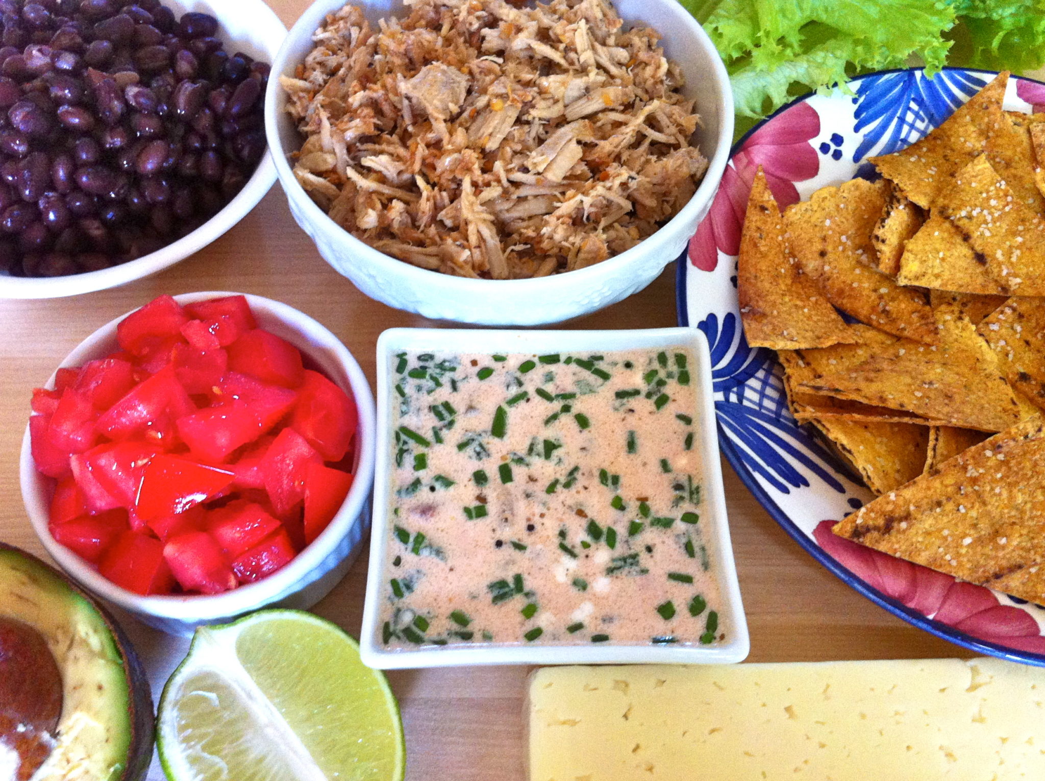 - Place the lettuce in a large serving bowl and layer with the black beans, cucumber, jicama, tomatoes, avocado, protein of choice, cheese, and tortilla chips.
