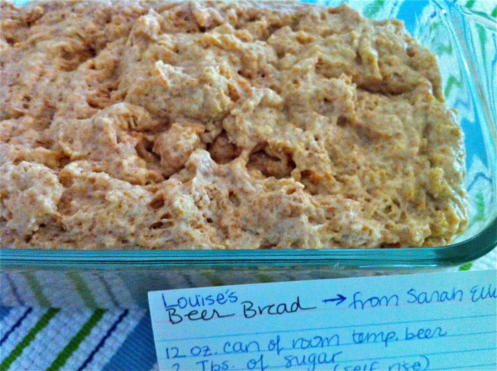 While I was there, we made beer bread. I still have the index card with the original recipe, which called for self-rising flour. Over the years, I have adapted the recipe, swapping out the self-rise flour and incorporating an option for whole wheat flour.
