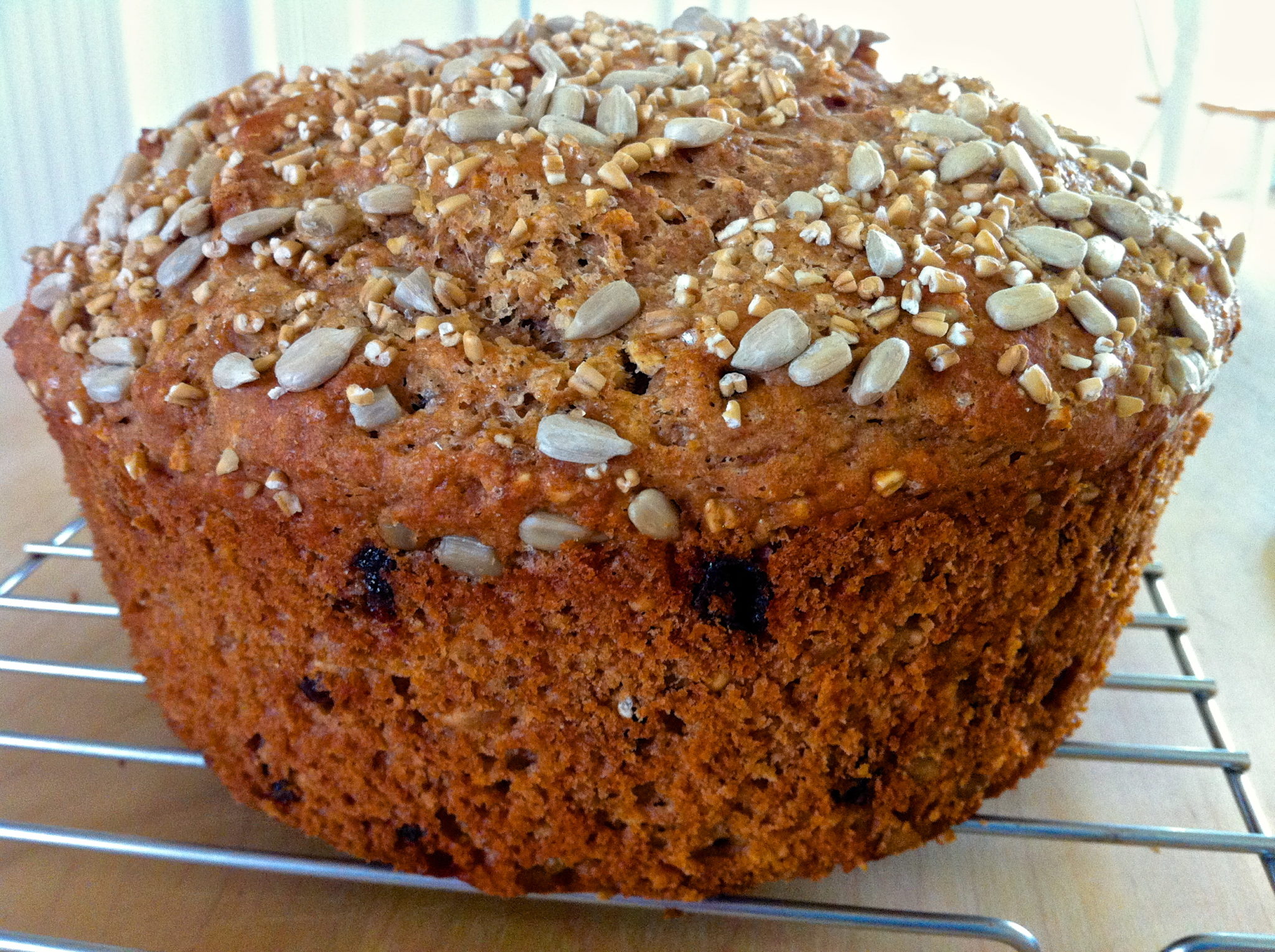Sunflower Raisin Brown Bread with Steel Cut Oats is a spin-off of my healthy version of Irish soda bread. I love it for all its texture and natural sweetness and especially for its health value. There isn’t a speck of refined flour, and steel cut oats are thrown in for added goodness and nuttiness. This bread is easy to make–no kneading, no rising–and tastes great fresh from the oven or leftover, whether served plain, buttered, drizzled with honey or–my favorite–slathered with peanut butter!